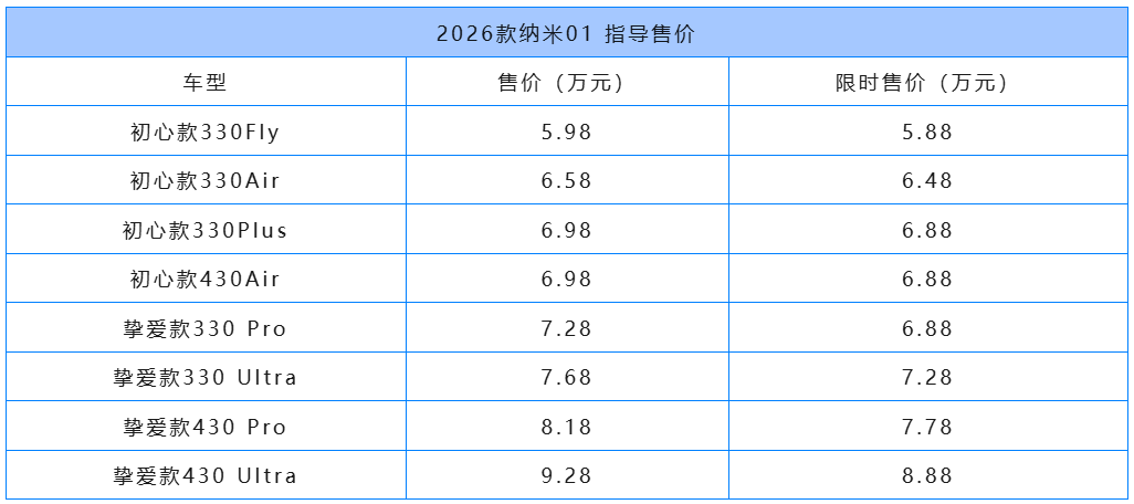 日前,2026款纳米01正式上市,新车共推出8款车型,售价区间为5.98-9.28万元,限时焕新售价区间5.88-8.88万元。另外购车可享七重礼,包括安心礼、焕新礼、金融礼、精品礼、充电礼、流量礼和缤纷礼。新车针对外观/智能/体验/安全四大维度升级,整体产品力再次得到提升。