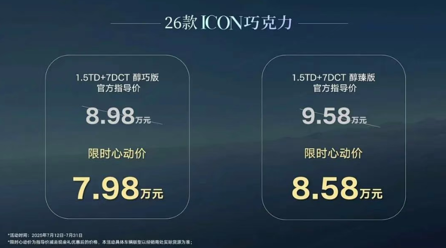 新款吉利ICON巧克力正式上市,新车共推出两款车型,官方指导价8.98-9.58万元,现金补贴后限时心动价7.98-8.58万元。享2年0息,换购补贴4000元。新车主要针对内饰进行升级,并搭载了14.6英寸悬浮式中控屏,中控娱乐系统也升级到了Flyme Auto系统。