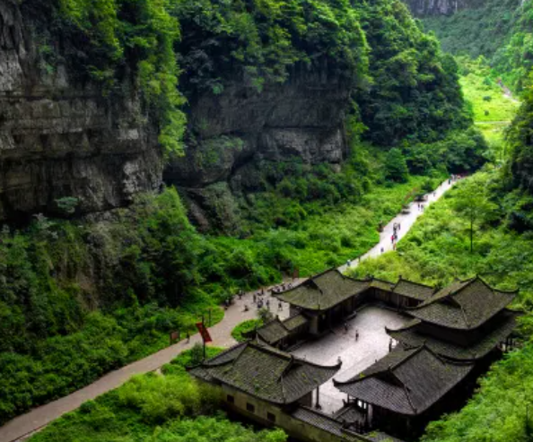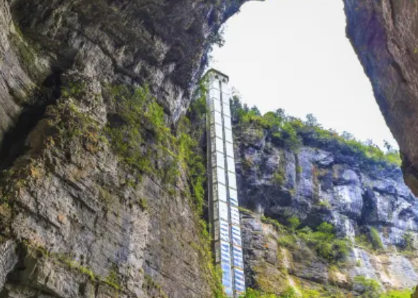 游客进入景区后,可以乘坐观光电梯下到谷底(电梯费用包括在门票内)的天坑中,再沿着坑底幽静的小道步行游览。此时环顾四周,满目苍翠,有溪水流淌;抬头仰望,四处是悬崖万丈,有山泉从上飞泻而下。
