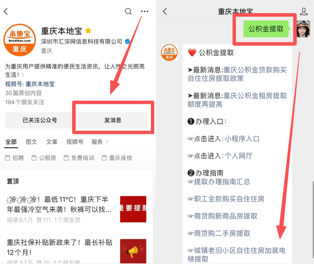 进入“重庆本地宝”在【重庆本地宝】微信对话框回复关键词【公积金提取】