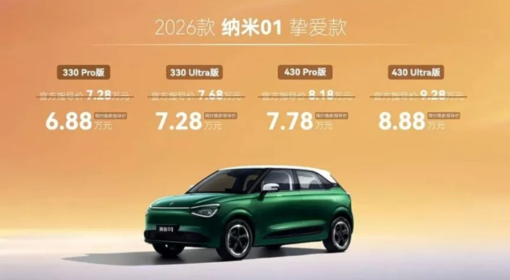 日前,2026款纳米01正式上市,新车共推出8款车型,售价区间为5.98-9.28万元,限时焕新售价区间5.88-8.88万元。另外购车可享七重礼,包括安心礼、焕新礼、金融礼、精品礼、充电礼、流量礼和缤纷礼。新车针对外观/智能/体验/安全四大维度升级,整体产品力再次得到提升。